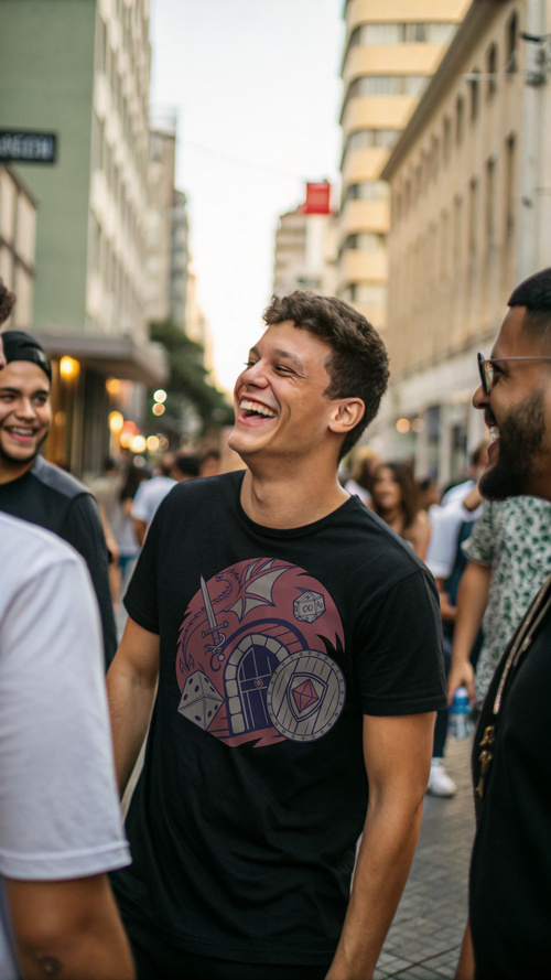 Fantasy RPG Dice & Gear T-Shirt — Sword, Shield & D20 Gaming Tee